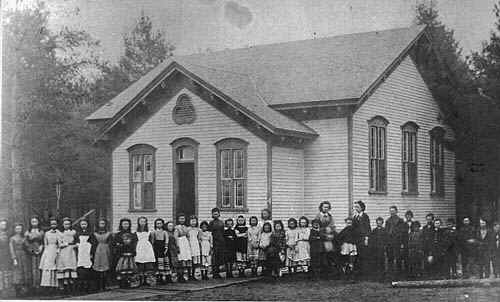 | This photograph shows Peshtigo's first schoolhouse, before the fire of 1871. It was located on the east side of the river, on the corner of Maple Street and Beebe Avenue. An engraving of this photograph was used in Frank Tilton's Sketches of the Great Fires in Wisconsin (see Bibliography). |